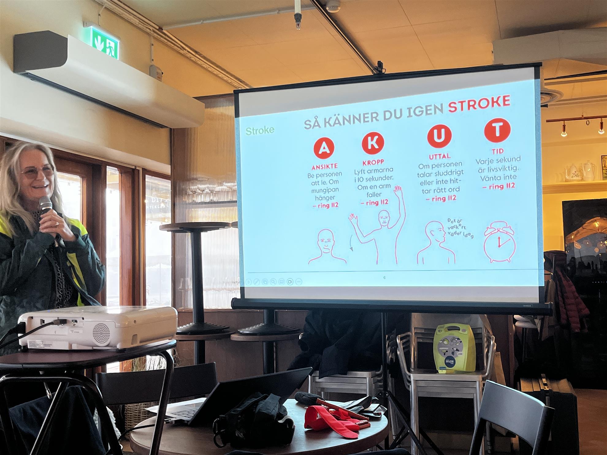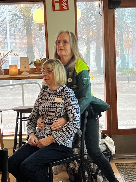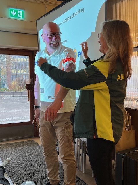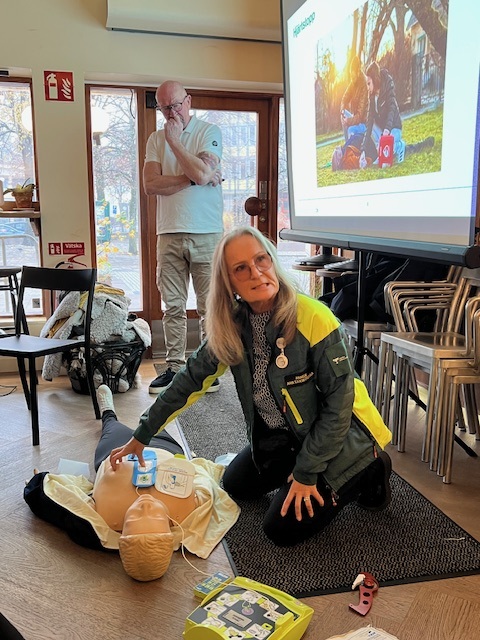 Denna morgon var vi hela 30 Rotarykamrater och en gäst, som lyssnade andäktigt till Christer Liljenberg och Annelie Nyberg som förklarade, gav tips och handfast visade hur vi går tillväga när någon blir akut sjuk (HLR och stoppa stora blödningar).